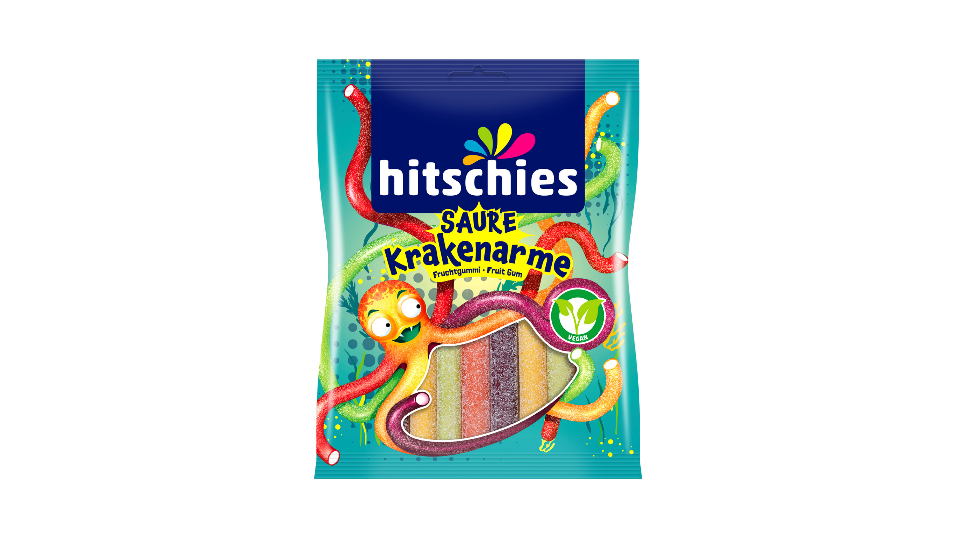 Unsere sauren Krakenarme sind lange, weiche Fruchtgummi-Stangen. Im Inneren sind sie vanillig-süß und von außen in den vier leckeren Geschmacksrichtungen Johannisbeere, Erdbeere, Orange und Apfel sauer-fruchtig ummantelt.
